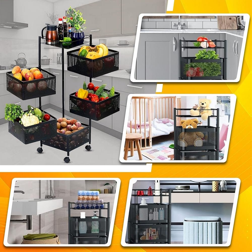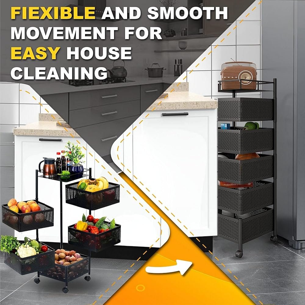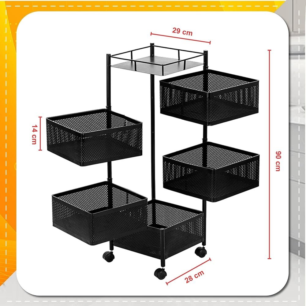 5-Layer Revolving Metal Kitchen Storage Rack with Wheels – Multipurpose Vegetable, Fruit, and Spice Organizer, Black