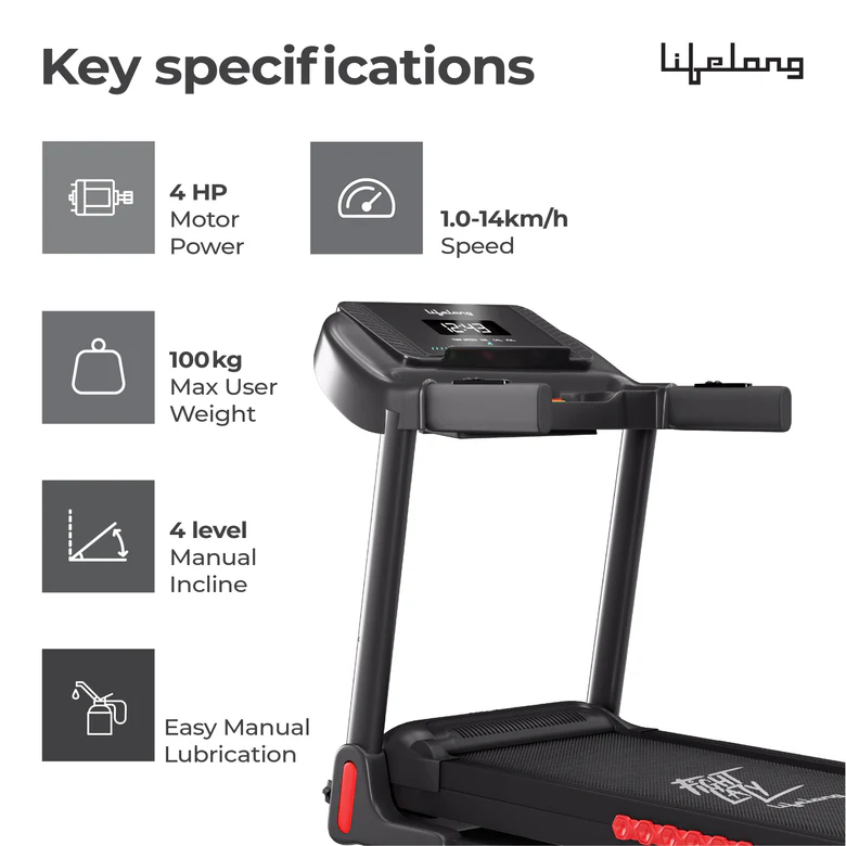 Lifelong FitPro 4HP Peak Motorized Treadmill | 14 km/h | Manual Incline | Foldable | Bluetooth | 100 kg Capacity