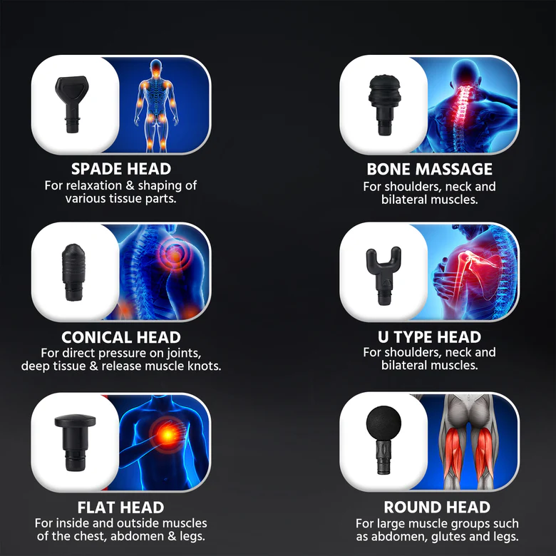 - 6 interchangeable massage heads for targeted full-body muscle relief and therapy