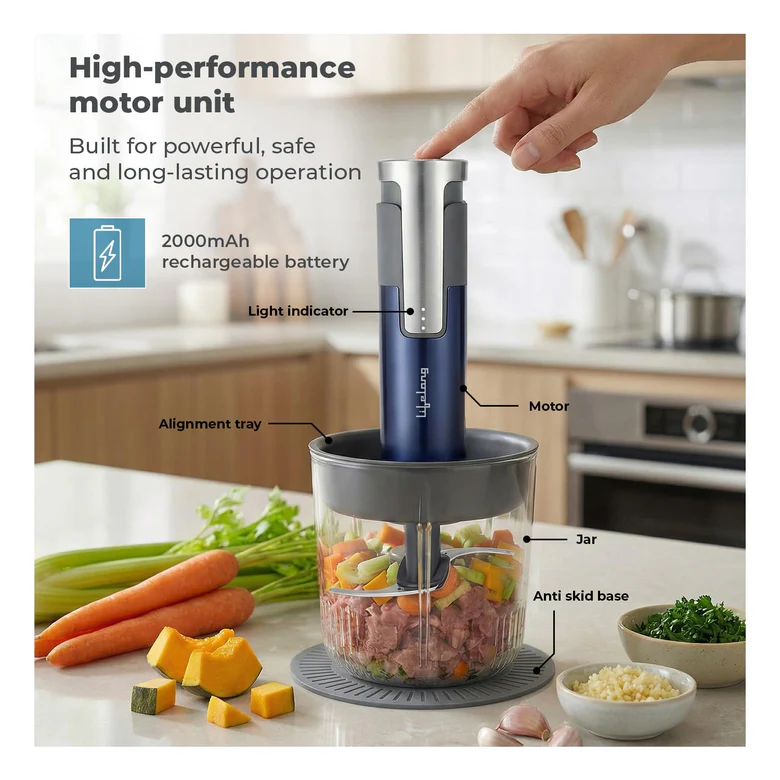 | Included Items | 1 Handheld Motor, 800 ml Jar, 2 Chopping Blade, 1 Silicone Pad, 3 Seasoning Bowls, 1 Whisker, 1 Garlic Peeler, 1 Type C Cable |