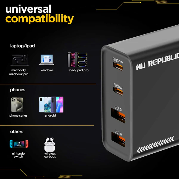 Nu Republic Cybotron 100W GaN Charger, Dual USB-C PD PPS 3.0 & Dual USB-A QC Ports, Fast Charging Adapter with Type-C to C Cable for MacBook, iPhone, Samsung, OnePlus, Nothing, Black