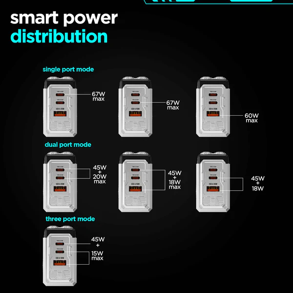 - Smart Power Distribution: Automatically manages power for safe and optimal charging up to 67W