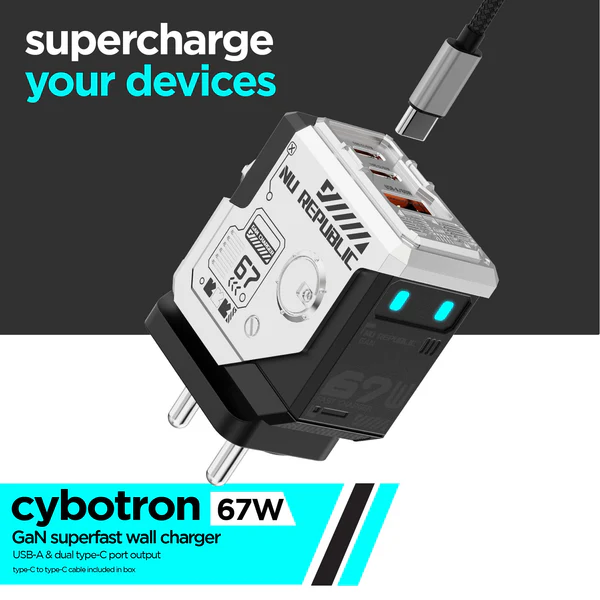 Be the first to review “Nu Republic Cybotron 67W GaN Fast Charger with 3 Ports (2 USB-C + 1 USB-A), QC PD Support & PowerBlitz Technology, Multi Device Charging Adapter with Type-C Cable for Laptops & Smartphones, Silver”