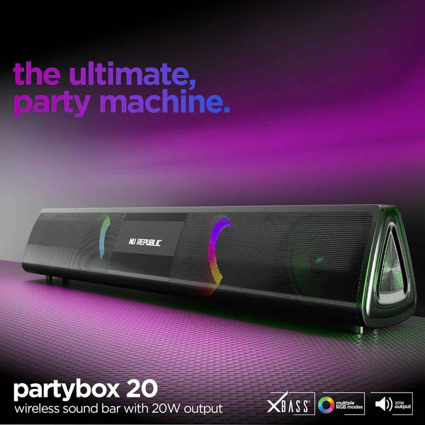 Partybox 20 Bluetooth Speaker with 20W RMS Output, Titanium Metal Texture Design, Multi RGB Light Modes, X-Bass® Technology & 16 Hrs Playtime, Portable Wireless Speaker for Party & Home Use